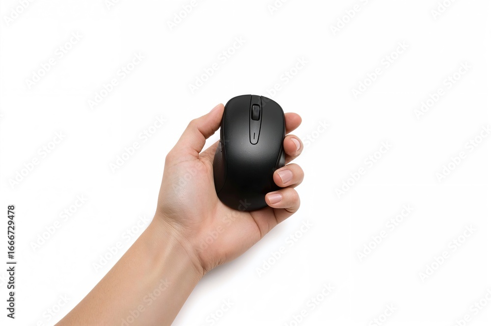 Obraz na płótnie Canvas - A person’s hand grasping a tiny dark-colored mouse against a plain white backdrop.