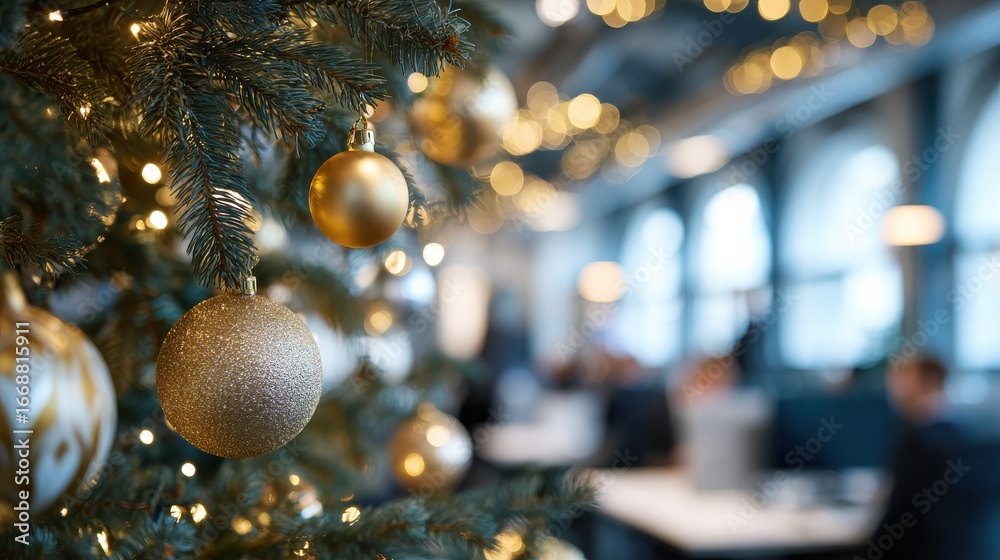>Obrazy na płótnie Canvas>Wybrane motywy - zobacz więcej !>Kolej>close up of decorated christmas tree in office with business people working in background xmas celebration in corporate office detail of christmas balls and lights with working office no logos no bra