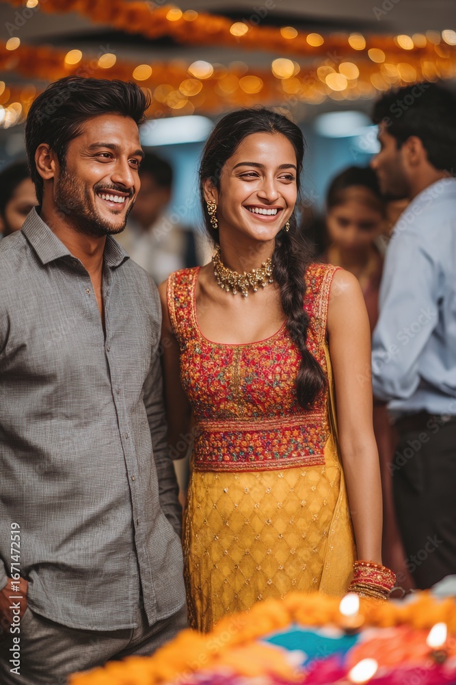 Obraz na płótnie Canvas - Joyful duo marking Diwali in festive outfits amidst vibrant decorations.