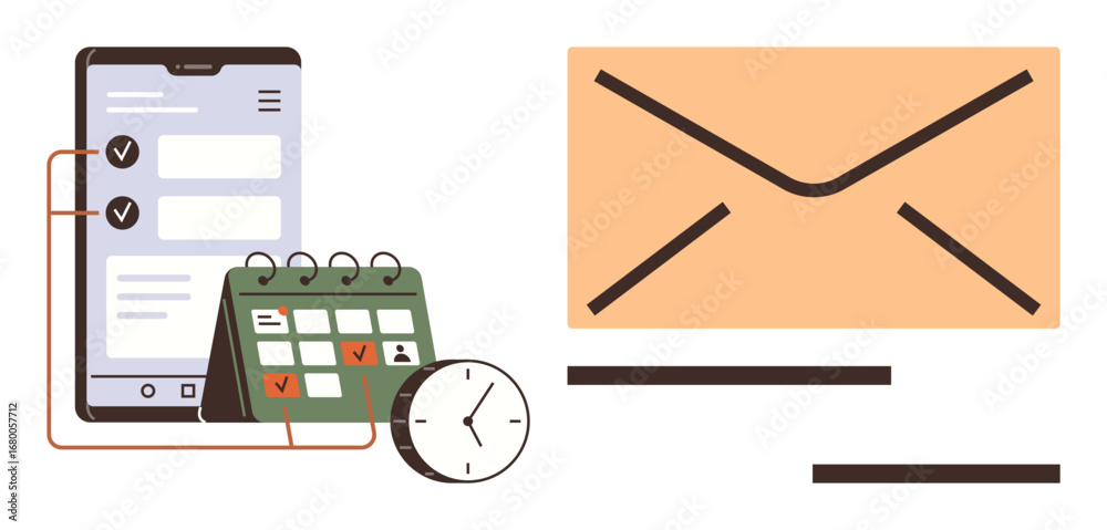 >Obrazy na płótnie Canvas>Wybrane motywy - zobacz więcej !>Kolej>Smartphone with task list, calendar, and clock alongside large envelope. Ideal for scheduling, time management, notifications, email, planning productivity and communication. Simple flat metaphor