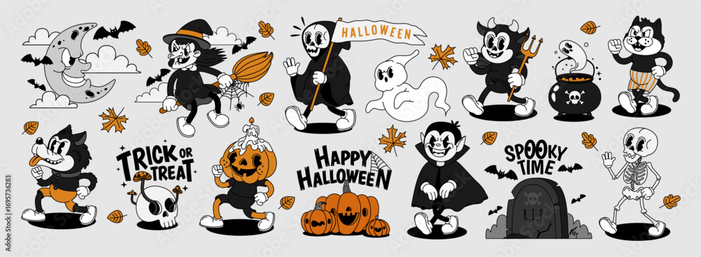 Obraz na płótnie Canvas - Halloween characters. Retro groovy holiday mascot. Comic spooky ghost, pumpkin, witch, skeleton, vampire, monster, devil, and werewolf. Funky night party. Vector set.