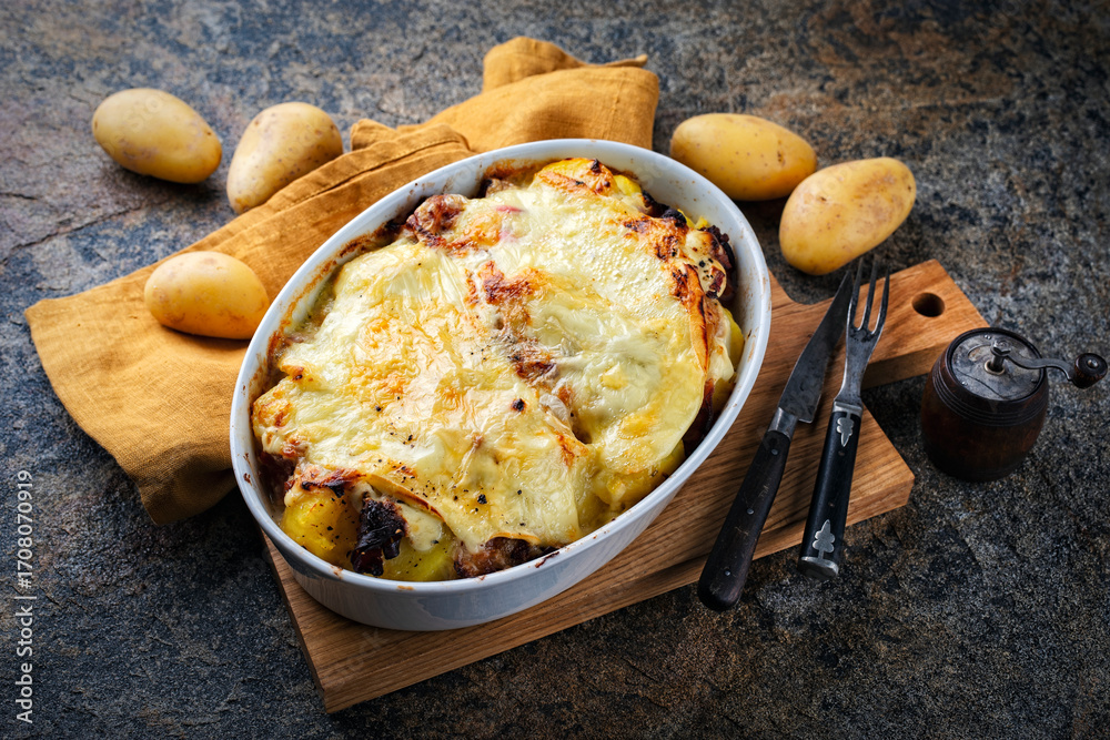 Obraz na płótnie Canvas - Artisan homemade oven baked tartiflette wih potato and reblochon cheese in casserole dish.