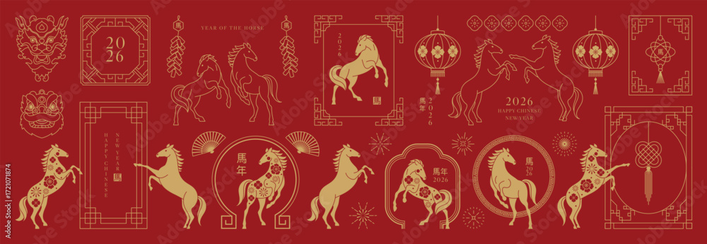 Obraz na płótnie Canvas - Chinese New Year 2026 element vector set. Year of the horse design. Lanterns, horse, firework, frame, pattern, cloud, coin, flower, pattern. Icons of Asian Lunar New Year holiday decoration. .