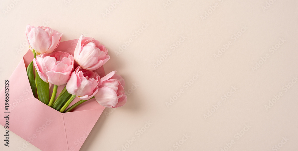 Obraz na płótnie Canvas - Happy Mother's Day greeting with pink tulips in a pastel envelope for spring celebration.