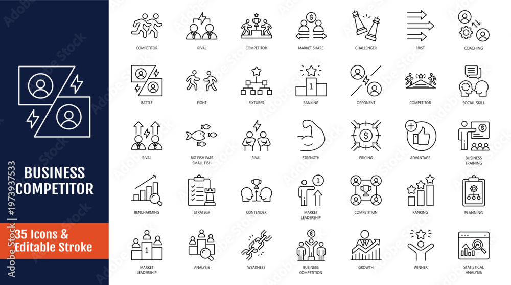 Obraz na płótnie Canvas - Business Competitor icon set. Icons related to competition, strengths, weakness, opponent, comparison, ranking, and more. Outline icon with Editable stroke. Vector illustration.