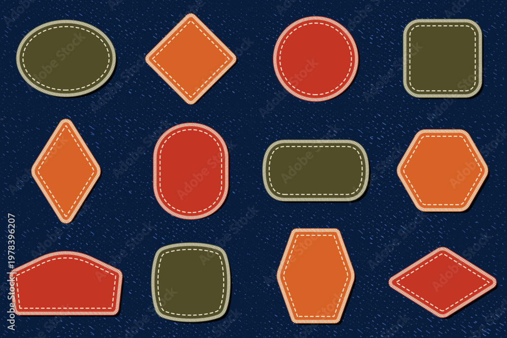 Obraz na płótnie Canvas - Geometric embroidery patches on denim background vector collection with circle square diamond stitched badges textile mockup for apparel design isolated on dark fabric texture.