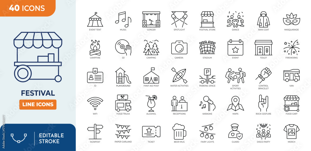 Obraz na płótnie Canvas - Festival line editable icon set. featuring icons of various music, parade, fireworks, lighting, celebration symbols, and more. Editable stroke. Vector illustration .