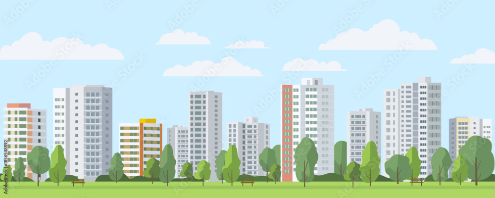 Obraz na płótnie Canvas - Cityscape of a residential area with various buildings and a park. Residential buildings with apartments. Real estate with apartments in a large city. Vector illustration..