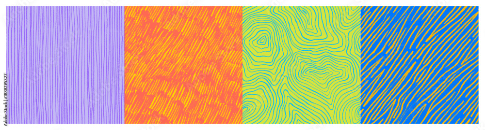 Obraz na płótnie Canvas - Funky colorful doodle crayon seamless pattern set. Hand drawn wood texture, zebra pencil lines, vertical thin stripes, cross hatch texture. Trendy funky doodle seamless pattern. Childish sketch drawin.