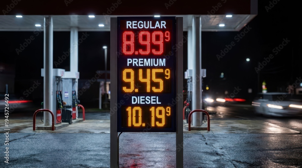 Obraz na płótnie Canvas - Nighttime Gas Station Price Sign Showing Fuel Costs in Dollars.