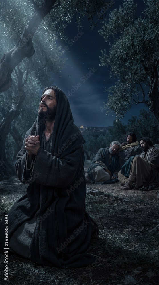 Obraz na płótnie Canvas - Jesus praying in Gethsemane garden at night. Man in robe kneeling under olive tree while disciples sleep. Biblical scene of suffering before crucifixion. Religious spiritual faith concept..