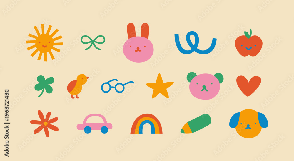 Obraz na płótnie Canvas - Colorful funny children doodle icon set. Cute happy kid drawing symbol collection, diverse education concept illustration bundle. Hand drawn diverse graphic elements. Includes dog, apple, rainbow..