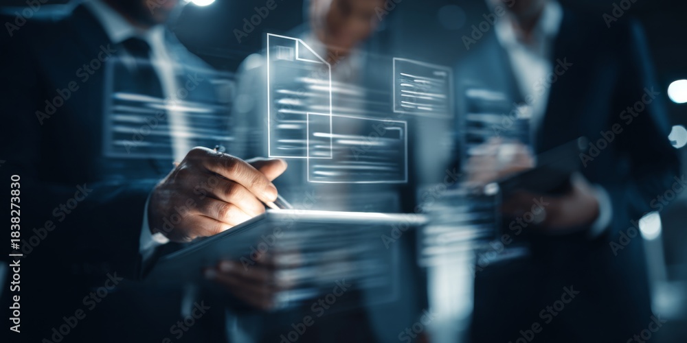 Obraz na płótnie Canvas - Business professionals discussing compliance regulations and legal frameworks with digital interface showcasing audit policies and governance documents.
