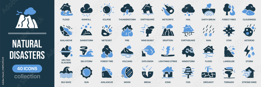Obraz na płótnie Canvas - Natural disasters fill icon collection. Includes extreme weather and emergency events. Created in colored style with blue palette.
