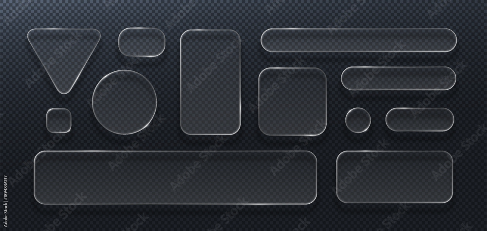 Obraz na płótnie Canvas - Transparent glass UI elements vector set on dark background, realistic glossy buttons panels frames, glassmorphism collection.