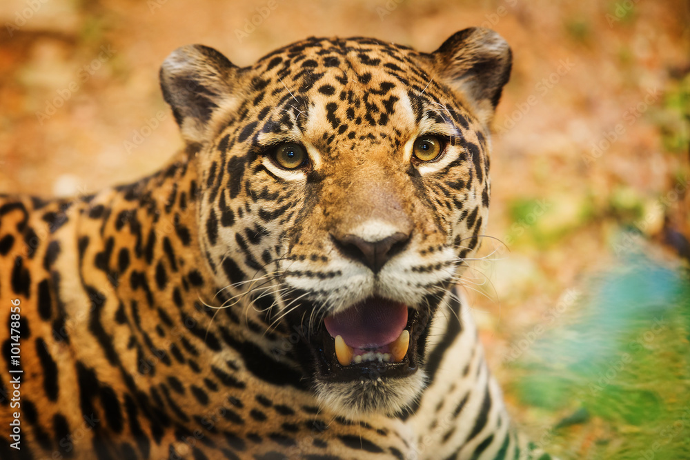Obraz na płótnie Canvas - Adult Female Jaguar sitting on the rock looking into the camera.
