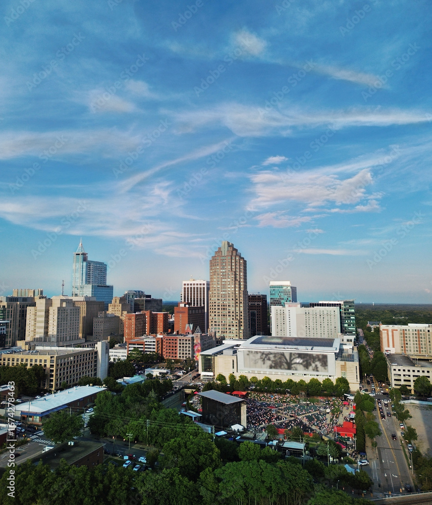 Obraz na płótnie Canvas - Aerial view of the Raleigh NC skyline and downtown amphitheater.