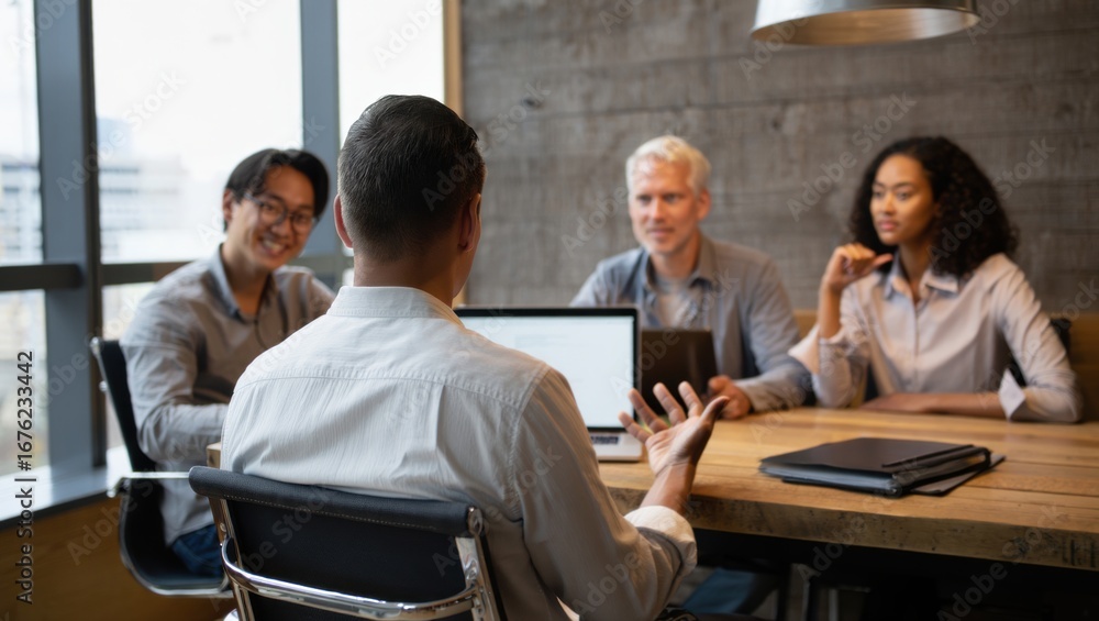 Obraz na płótnie Canvas - Businessman sitting at conference table, engaging with colleagues while passionately presenting innovative ideas in modern office setting. Business team on business meeting..