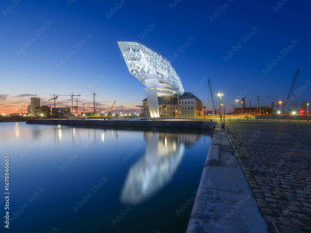 Obraz na płótnie Canvas - Port Authority of Port of Antwerp-Bruges. Modern main building of the port in Antwerp, Belgium. Evening urban architectural landscape. View during sunset. Background, postcard, wallpaper..
