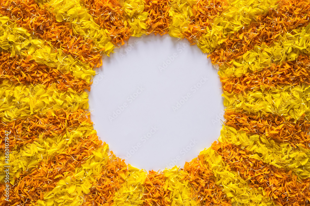 Obraz na płótnie Canvas - Decorative yellow and orange color of marigold flowers petals rangoli for Diwali festival with white space background..