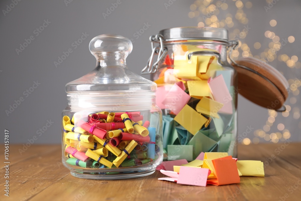 Obraz na płótnie Canvas - Colorful paper notes in glass jars on wooden table against grey background with blurred lights. Bokeh effect.