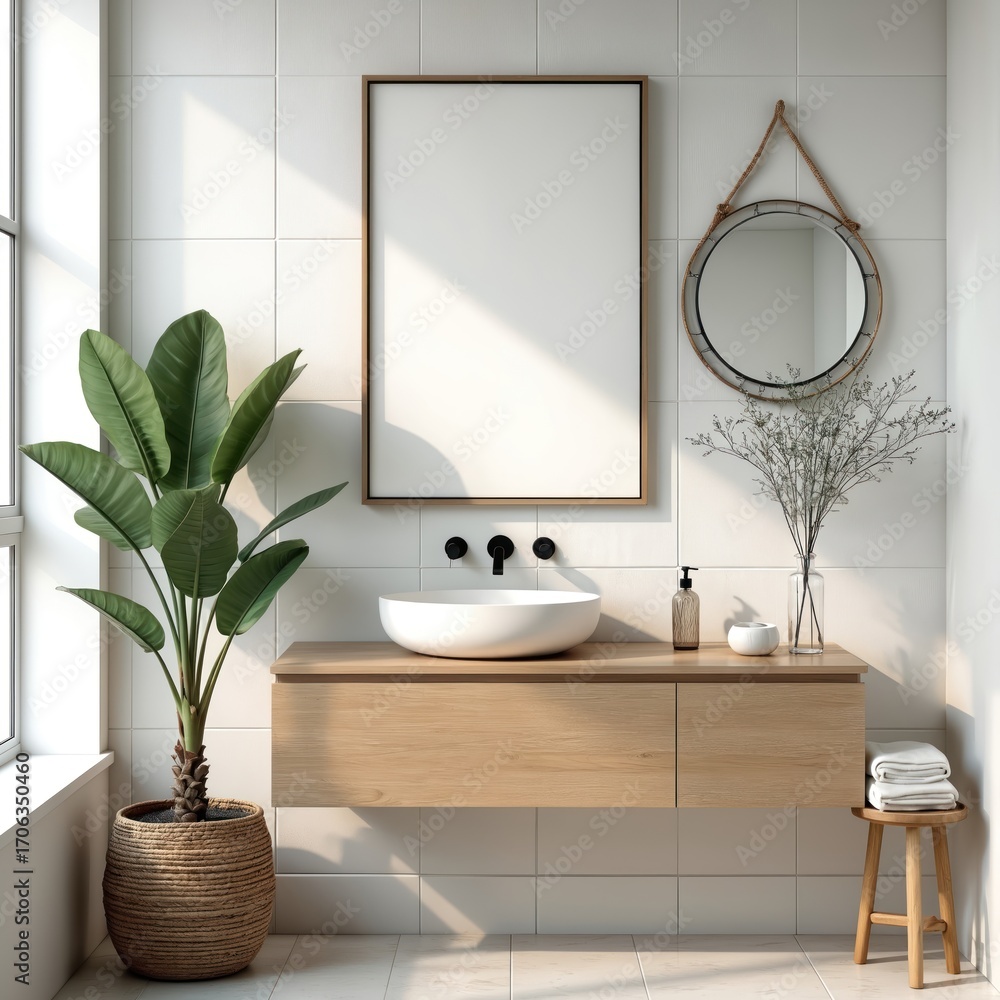 Obraz na płótnie Canvas - Modern bathroom interior mockup featuring large blank poster frame above floating vanity with sink. Natural light streams in from window, illuminating potted plant, decorative mirror. Clean, stylish.