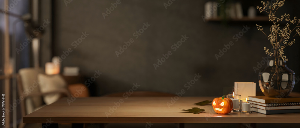 Obraz na płótnie Canvas - Glowing jack-o-lantern halloween pumpkin and candles aside books on wooden table in a dim lit room..