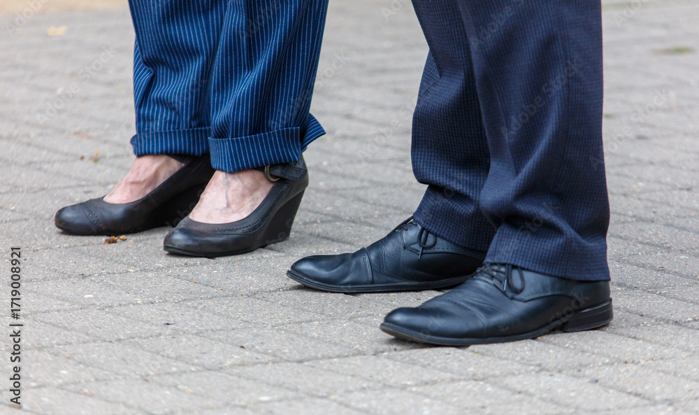 Obraz na płótnie Canvas - Two people standing next to each other with their feet on the ground.