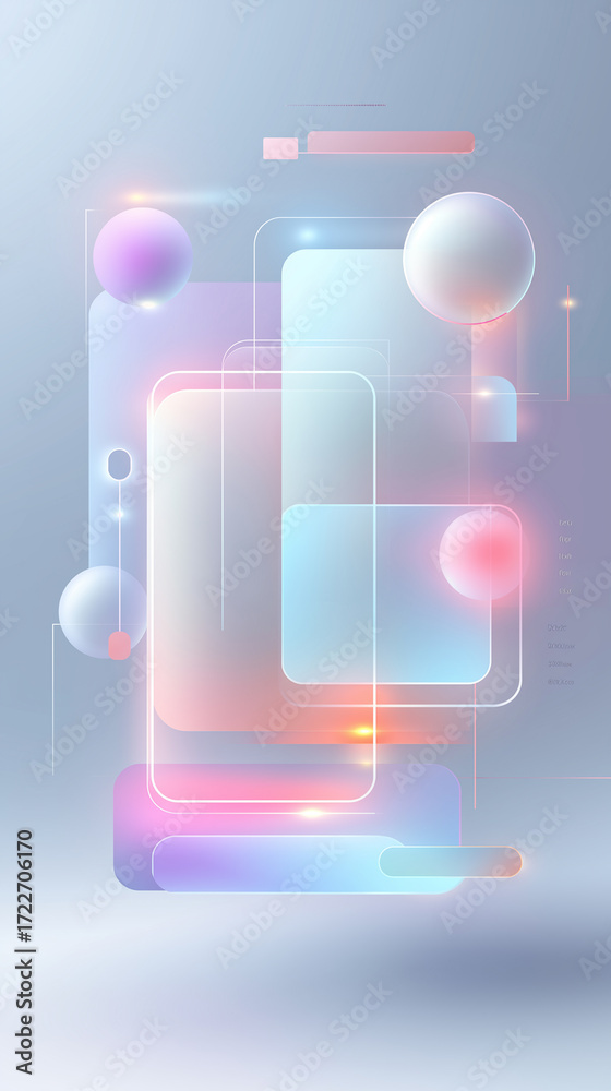 Obraz na płótnie Canvas - Colorful abstract 3D illustration with pastel gradients, spheres, and glass-like UI shapes. .