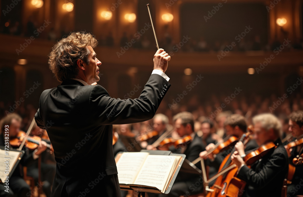 Obraz na płótnie Canvas - Conductor directs symphony orchestra in grand concert hall with ornate ceiling. Musicians play instruments, brass, string, percussionists. Elegant backdrop for classical music performance..