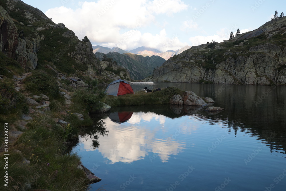 Obraz na płótnie Canvas - Escape to breathtaking alpine lake camping with your dog and a red tent reflecting in the water for an unforgettable adventure.