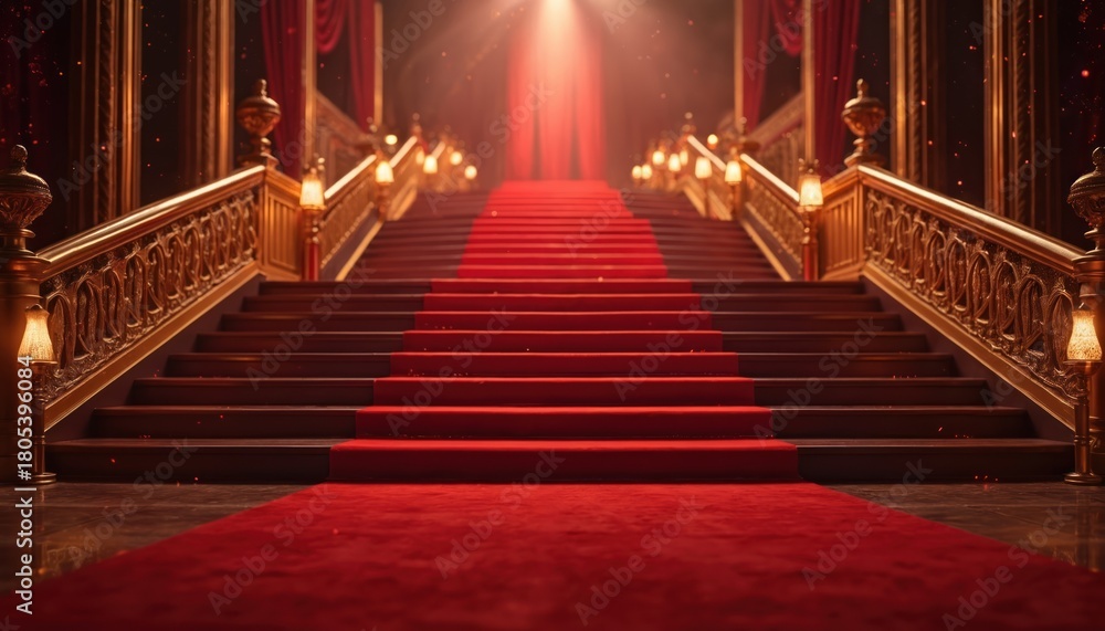 Obraz na płótnie Canvas - Illustration of a grand staircase with red carpet gold railings and spotlights. The scene creates a sense of luxury and glamour. Ideal for award show concepts..