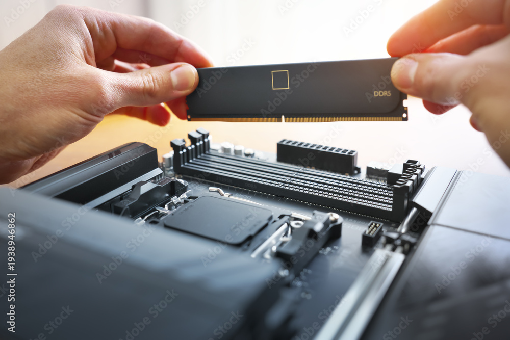 Obraz na płótnie Canvas - Technician installing high-speed DDR5 RAM into a computer motherboard.