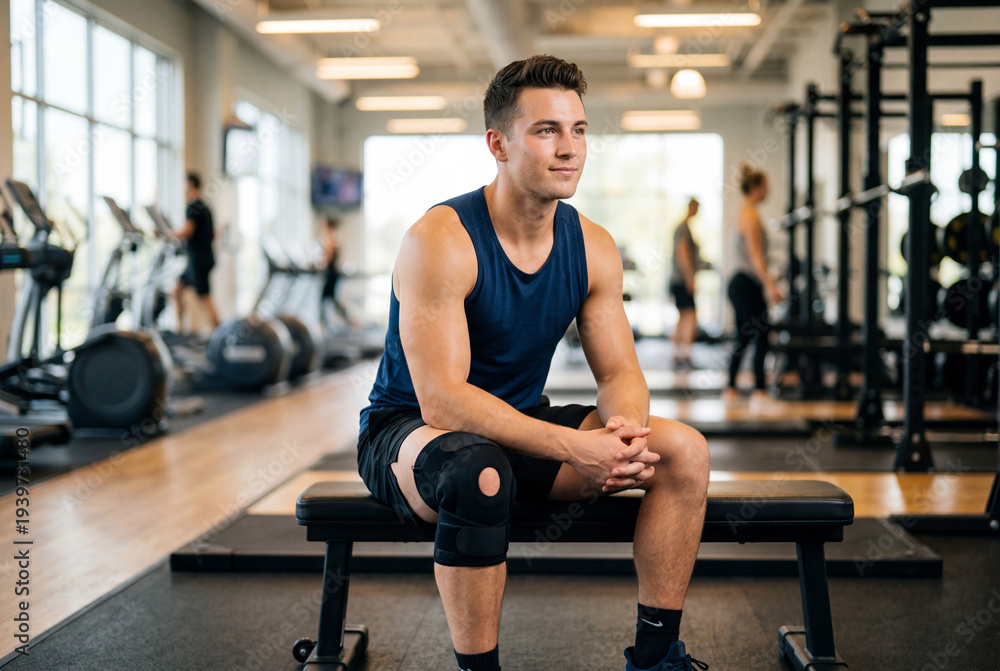 Obraz na płótnie Canvas - Handsome male athlete wearing knee brace resting on bench inside modern fitness center.