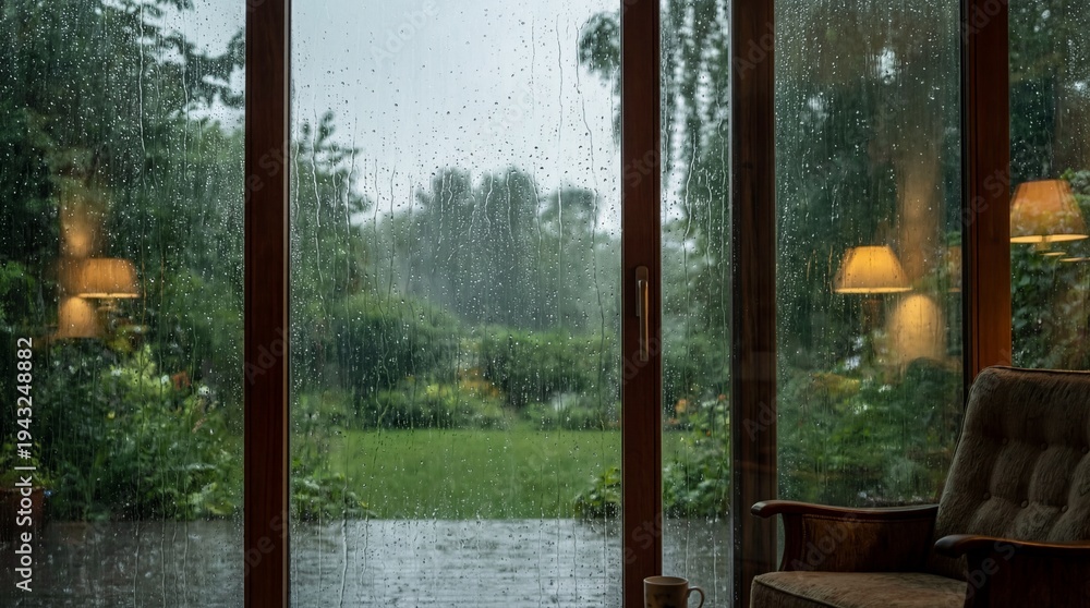 Obraz na płótnie Canvas - raindrops on large glass window looking out into lush green garden. heavy rain pouring outside. cozy home interior with warm lamp light and armchair. relaxation concept. banner, website header..