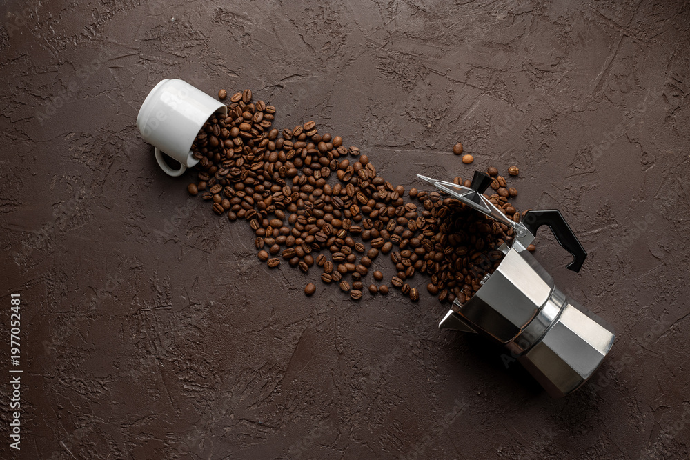 Obraz na płótnie Canvas - Geyser coffee maker with white cup and coffee beans on brown stone background, top view. Food concept photo.