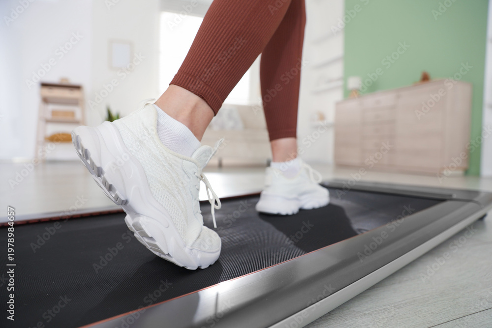 Obraz na płótnie Canvas - Sporty woman training on treadmill at home, closeup.