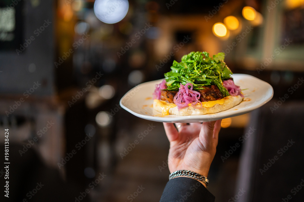 Obraz na płótnie Canvas - A waiter holds a white plate with a gourmet open-faced lamb burger topped with pickled red onions and fresh greens in a dimly lit, upscale restaurant or bar setting..