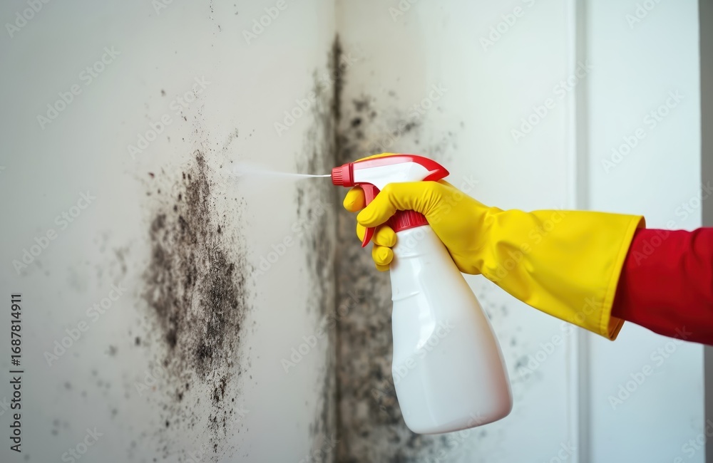 Obraz na płótnie Canvas - Worker in yellow protective glove sprays cleaning solution onto moldy wall. Closeup view of hand applying cleaner to remove fungal growth, mildew, spores. Home hygiene, health essential for clean.