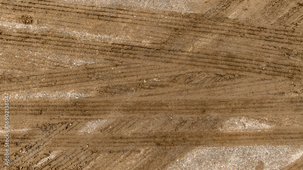 Obraz na płótnie Canvas - Aerial top view tire track on dirt sand mud, Texture of wet mud road with puddle and Tyre or tire track in countryside, Wheel tyre or tire track on mud, texture and background..