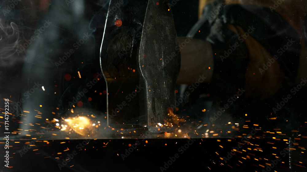 Obraz na płótnie Canvas - Close-up of blacksmith forging glowing hot iron on anvil with flying sparks.