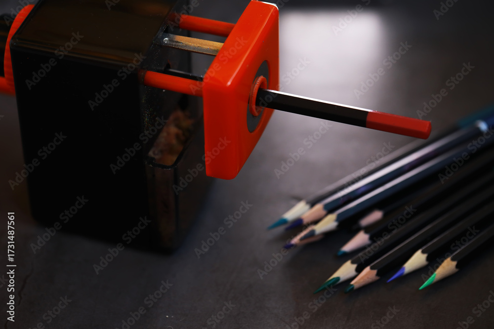 Obraz na płótnie Canvas - Electric Pencil Sharpener and Colored Pencils on Dark Desk Background.
