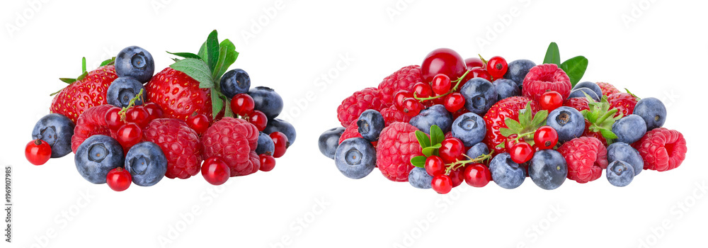 Obraz na płótnie Canvas - Berries arranged in groups with green leaves present, PNG.