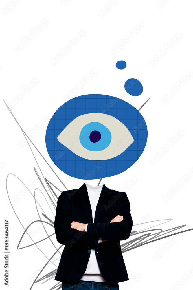 Obraz na płótnie Canvas - Creative trend artwork design 3D collage sketch of caricature headless man stand eye head look escape vision control scrutiny spy watch.