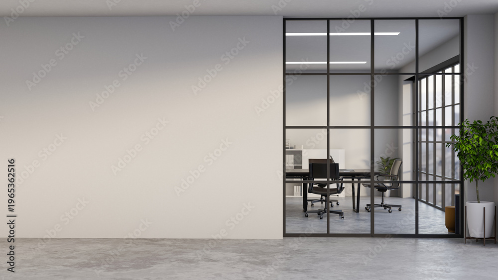 Obraz na płótnie Canvas - Potted plant on grey stone floor corridor aside glass wall and white wall of meeting room in office..