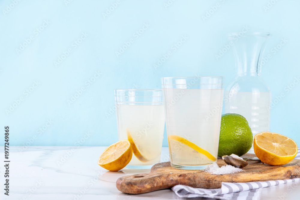 Obraz na płótnie Canvas - Healthy homemade Electrolyte Drink made with salt, sugar, citrus fruit (lemon and lime) juice. Sport isotonic beverage for good hydration.