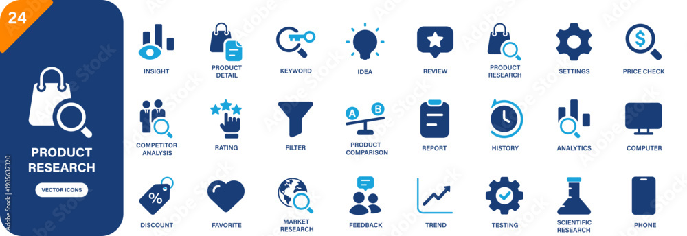 Obraz na płótnie Canvas - Product research icon collection featuring competitor analysis, product comparison, product detail, price check and market research symbols. Solid vector icons..