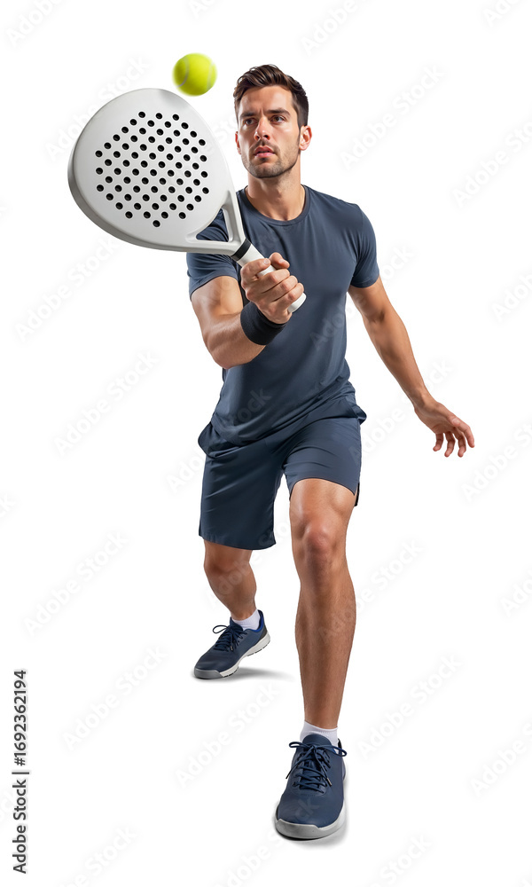 Obraz na płótnie Canvas - Active padel player in dark outfit striking a ball on isolated transparent background.