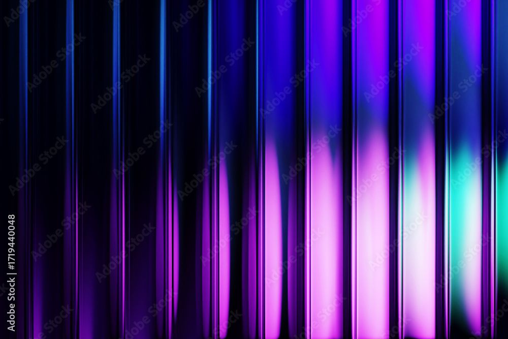 Obraz na płótnie Canvas - Neon ribbed fractal glass texture 3d background. Abstract bright fluted vertical line pattern with purple blue green gradient, radiant color effect on dark bg. Futuristic digital tech. 3D illustration.