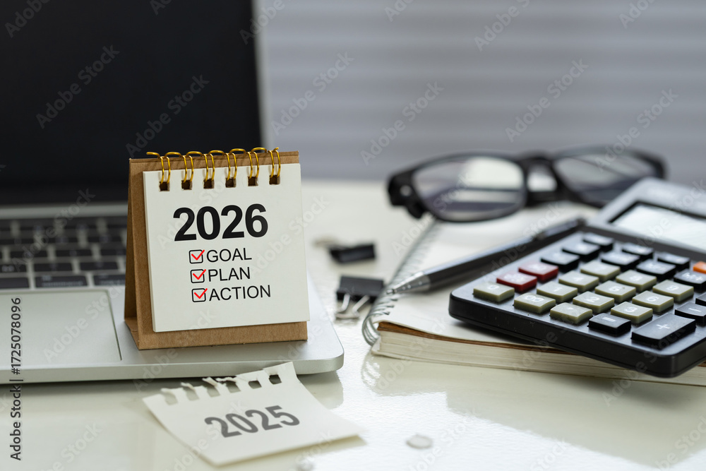 Obraz na płótnie Canvas - Desk calendar 2026 with checklist Goal, Plan, Action on office workspace beside calculator, notebook, pen and laptop, represent financial planning, budget, KPI targets and execution for the new year.